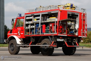 Der Aufbau des TLF 3000 stammt aus der Auxilium-Baureihe von Lentner. Um die Geländegängigkeit des Unimog-Fahrgestells nicht einzuschränken besitzt der Aufbau keine tiefgezogenen Geräteräume oder dergleichen. Die vier seitlichen und der rückwärtige Geräteraum enden jeweils auf einer Linie über der Hinterachse. Jedoch gibt es unter allen Geräteräumen ausklappbare Trittbretter als Entnahmehilfe. Zwischen den Geräteräumen verbergen sich ein 3.000 Liter großer Wasser- und ein kleinerer 120 Liter fassender Schaummitteltank. Sie sind beide mit der im Geräteraum GR verbauten Feuerlöschkreiselpumpe verbunden. Die FPN 10-2000 von Lentner hat eine Leistung von 2.000 Litern pro Minute bei zehn bar und ist mit einer Druckzumischanlage ArchimeDOS ausgestattet. Gesteuert werden Pumpe und Schaumzumischanlage über zwei kleine Bildschirmbedienteile mit Kontexttasten. Für die unmittelbaren Pumpenfunktionen stehen aber auch einzeln belegte Taster zur Verfügung. Zusätzlich lässt sich die Pumpenanlage auch über das Bedienfeld am Fahrerplatz steuern, wenn das TLF 3000 im sogenannten Pump-and-Roll-Betrieb zum Einsatz kommt. Der Nebenantrieb des Unimog ist nämlich so ausgelegt, das er das Zuschalten der Pumpe bei langsamer Fahrt erlaubt.