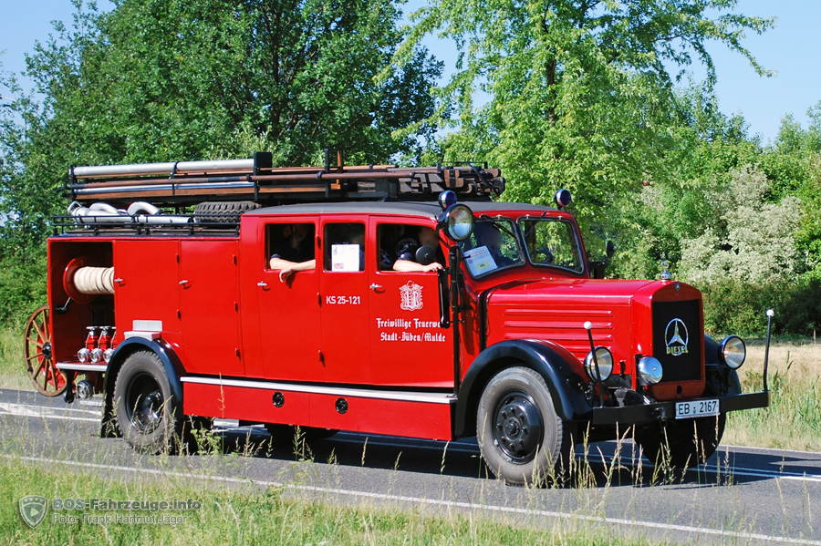 KS 25, Mercedes-Benz LoS 3750, Aufbau Metz, Baujahr 1936, ausgeliefert 1937 an das Reichsluftfahrtministerium, Stationierungsort(e) unbekannt, bei Kriegsende in Bad Düben liegengeblieben und von Feuerwehrmännern hinter Stroh „sichergestellt“, später in den Fuhrpark der FF übernommen, bis 1971 im Einsatz, seitdem Traditionsfahrzeug.