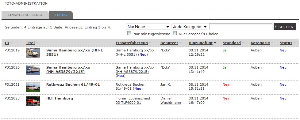 Wir bei BOS-Fahrzeuge.info arbeiten grundsätzlich bei Freischaltungen/Ablehnungen im 4-Augen-Prinzip. Das heißt, alle neuen Bilder und Datensätze werden mindestens von zwei Administratoren gesichtet. Da wir quer durch Europa verstreut sitzen, bedienen wir uns hierzu dem System "Skype", das uns Gruppendiskussionen in Echtzeit ermöglicht. Sobald sich vier Augen gefunden haben, wird die Warteschlange geöffnet und die Bilder in der chronologischen Reihenfolge gesichtet. Ausnahmen bilden hier nur Detail und Innenaufnahmen, diese werden bevorzugt zuerst behandelt, um auf der Startseite möglichst aussagekräftige Außenaufnahmen unter den letzten Freischaltungen zu haben.