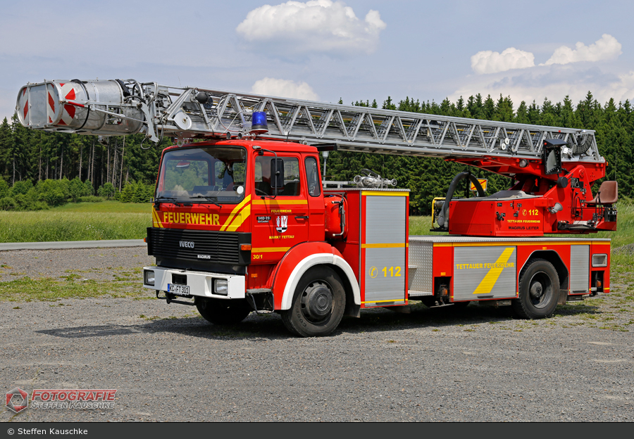 Von 2010 bis 2017 verrichtete diese 1985 gebaute Drehleiter auf Iveco 190-19 ihren Dienst bei der FF Tettau im Landkreis Coburg. Kurz vor ihrer Außerdienststellung konnte Steffen Kauschke die DLK mit Magirus Aufbau noch einmal ablichten.
