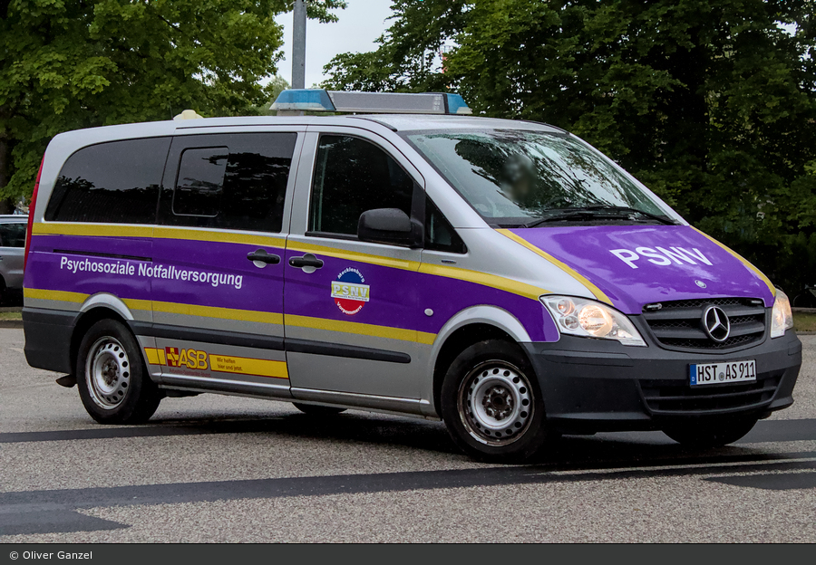 Kommen wir zu einer besonderen Farbe. Oliver Ganzel konnte das Einsatzfahrzeug der Psychosozialen Notfallversorgung (PSNV) des ASB Regionalverband Nord-Ost ablichten. Der Mercedes-Benz Vito ist in lila beklebt.