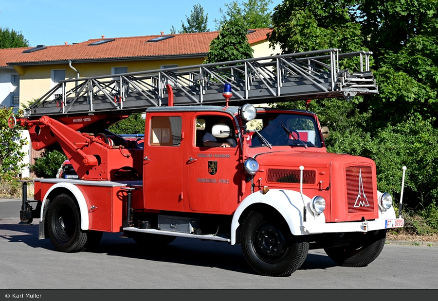 Eine ehemalige Drehleiter der Freiwilligen Feuerwehr Frankenthal auf einem Magirus-Deutz S 3500 Fahrgestell bekam Karl Müller vor die Linse. Das aus dem Jahr 1953 stammende Fahrzeug ist mit einem Magirus-Aufbau versehen.