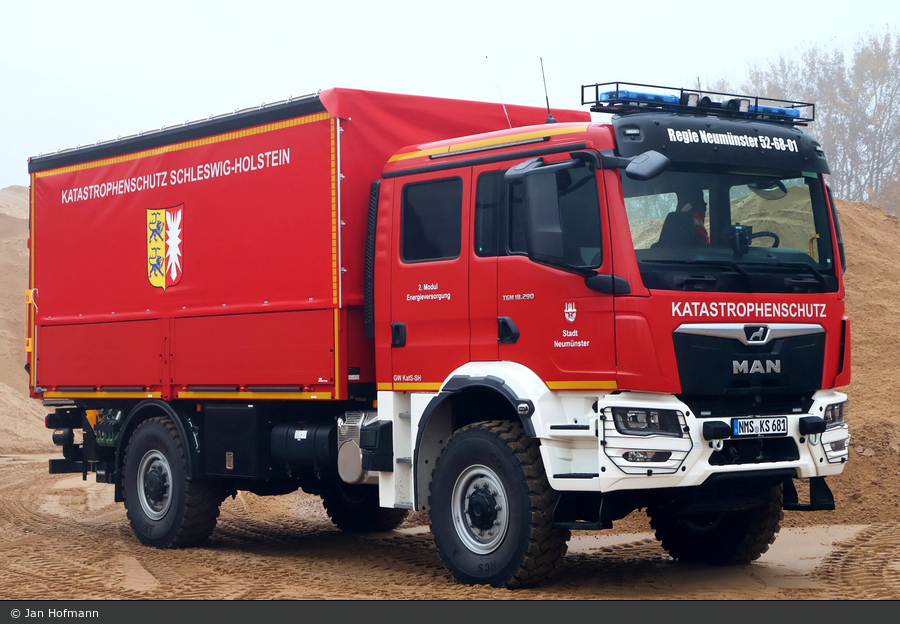 Auch das Land Schleswig-Holstein investierte in den Katastrophenschutz. Bei der Regieeinheit der Stadt Neumünster konnte Jan Hofmann einen von dreißig Gerätewagen-Logistik des Katastrophenschutzes ablichten. Freytag Karosseriebau baute die MAN TGM 18.290 4x4 auf.