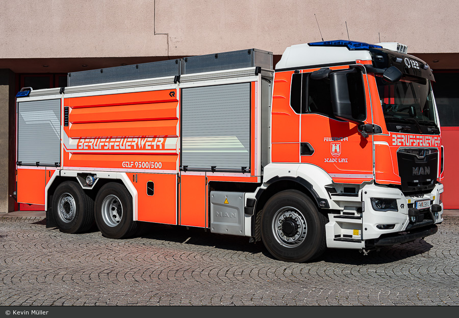 Bei der Berufsfeuerwehr Linz fuhr Kevin Müller dieses GTLF 9500/500 vor die Linse. Der MAN TGS 26.500 wurde im Jahr 2025 von Rosenbauer aufgebaut.
