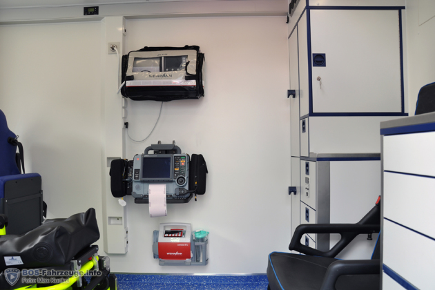 Die Medizinische Beladung entspricht der DIN EN 1789 Typ C für Rettungswagen (Mobile Intensive Care Unit) und umfasst unter anderem ein Beatmungsgerät vom Typ Weinmann Medumat Standard 2 mit CPAP-Funktion, ein EKG/Defibrillator vom Typ Physiocontrol Lifepak 15 in Vollaustattung und einen Prototyp der elektrischen Absaugpumpe Weinmann AccuvacPro, welche allesamt übersichtlich und gut erreichbar, ähnlich wie auch bei den Bayern-RTW, an einer Seitenwand übereinander platziert worden sind.
