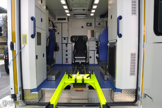 Neben der ungewöhnlichen Kombination aus Fahrgestell und Aufbau - hierbei dürfte es sich auch um den ersten Fahrtec-Koffer auf einem Ford-Fahrgestell handeln - weist das Fahrzeug jede Menge weitere Besonderheiten auf. So ist der Aufbau als Mehrzweckfahrzeug konzipiert, was sich dadurch auszeichnet, dass anstelle des sonst bei den meisten RTW üblichen, mittig und entgegen der Fahrtrichtung platzierten Notsitzes, eine Aufnahmeeinrichtung samt zugehörigem Tragestuhl der österreichischen Firma Dlouhy befindet. Auch wenn die Schiebetüre bei dieser Koffervariante von Fahrtec deutlich schmaler ausfällt, als bei Fabrikaten anderer Hersteller, bietet diese dennoch ausreichend Platz für ein komfortables Begehen und Verlassen des Fahrzeuges samt dem Tragesessel.