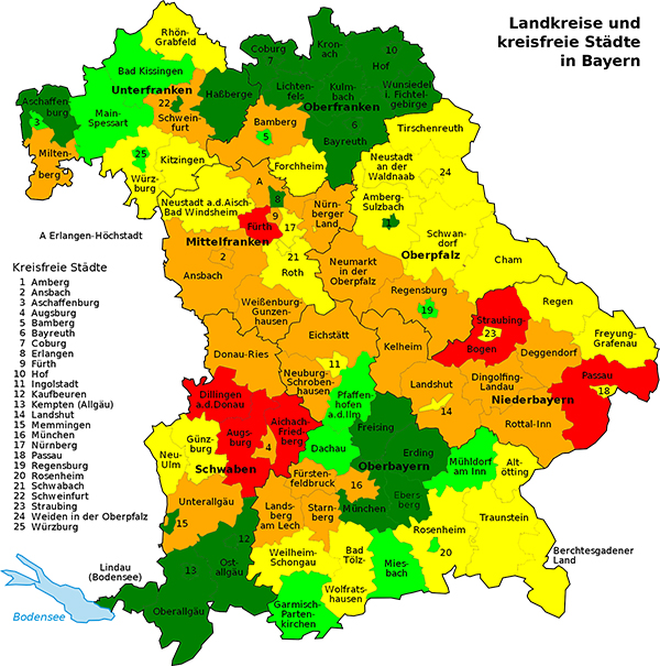 Mit dem Landkreis Aschaffenburg haben wir in Bayern erneut einen neuen Vertreter in der dunkelgrünen Spitzengruppe. Zusätzlich haben sich Regen zu gelb und Pfaffenhofen an der Ilm zu hellgrün vorgearbeitet. Insgesamt konnten wir in Bayern 135 neue Datensätze verzeichnen.