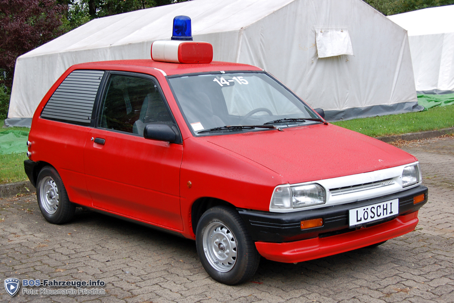 TLF 1,3/2, Mazda 121, Eigenumbau, Baujahr zwischen 1988 und 1991, Mini-TS, 200l-Wasserfass, 3 D- Anschlüsse außen an der Karosserie