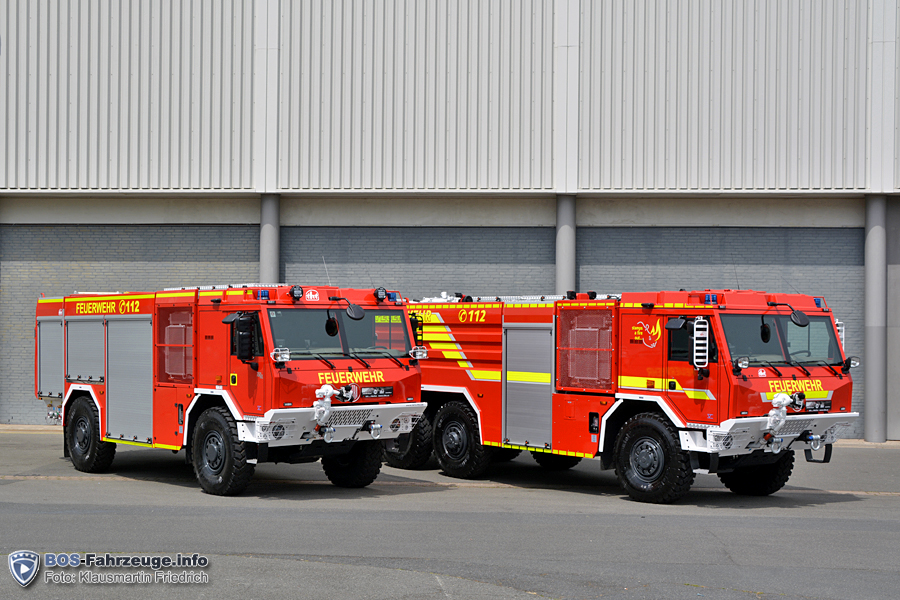 2x Tatra T815-7 mit Aufbauten von THT: links eines der schon bekannten Fahrzeuge des Typ TLF 5000-W BB für Brandenburg und Mecklenburg-Vorpommern, rechts ein dreiachsiges (W-)TLF mit 8500 l Wasser, 510 l Schaummittel sowie einer kombinierten ND-/HD-Pumpe.
