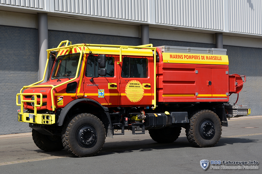 Mit vierköpfiger Besatzung üblicherweise bei der Marinefeuerwehr im Raum Marseille unterwegs: CCFM auf Unimog U 5023 mit Gimaex-Aufbau und 14.500 kg Gesamtmasse.